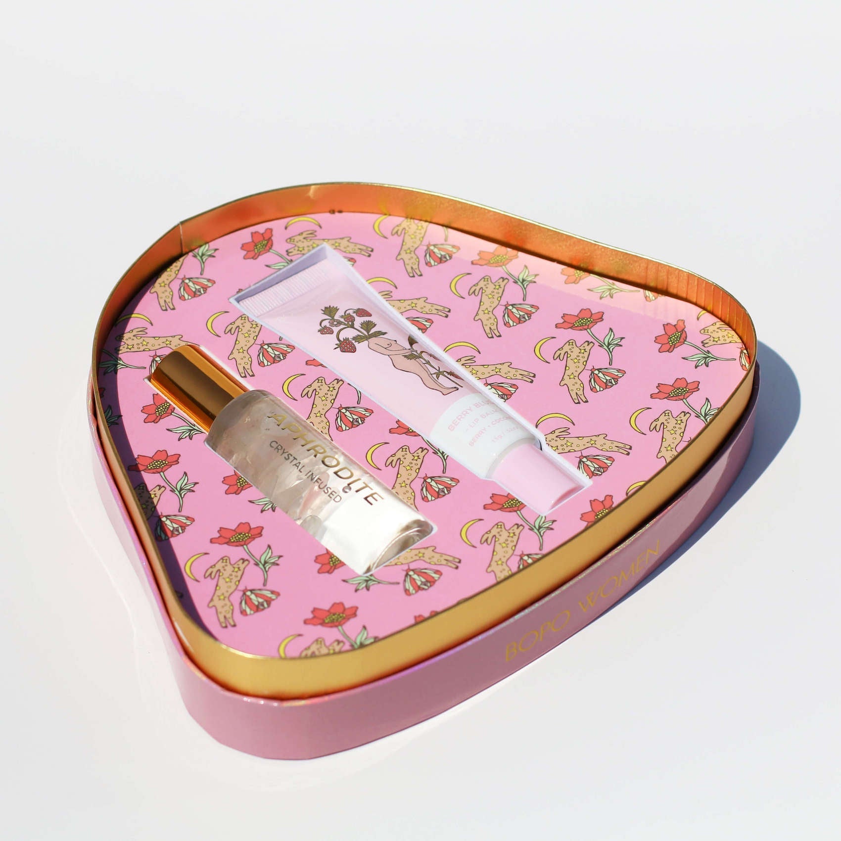 This gift set arrives in the prettiest gifting box you've ever seen and features our Aphrodite Crystal Infused Essential Oil Roller and Berry Blush Lip Balm. They're the perfect duo to add a touch of luxury to your everyday. Pop them in your bag so a little bit of self-care is always in reach. Aphrodite is a crystal infused essential oil blend to cultivate love & abundance in your life and is perfect as a light natural perfume alternative. It combines the heavenly ylang ylang with grapefruit, sweet orange, patchouli and mandarin essential oils to create a feminine blend fit for a goddess. The Berry Blush Lip Balm is packed with natural ingredients to provide long-lasting nourishment that soothes, softens and conditions lips while locking in moisture.