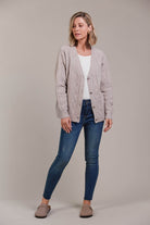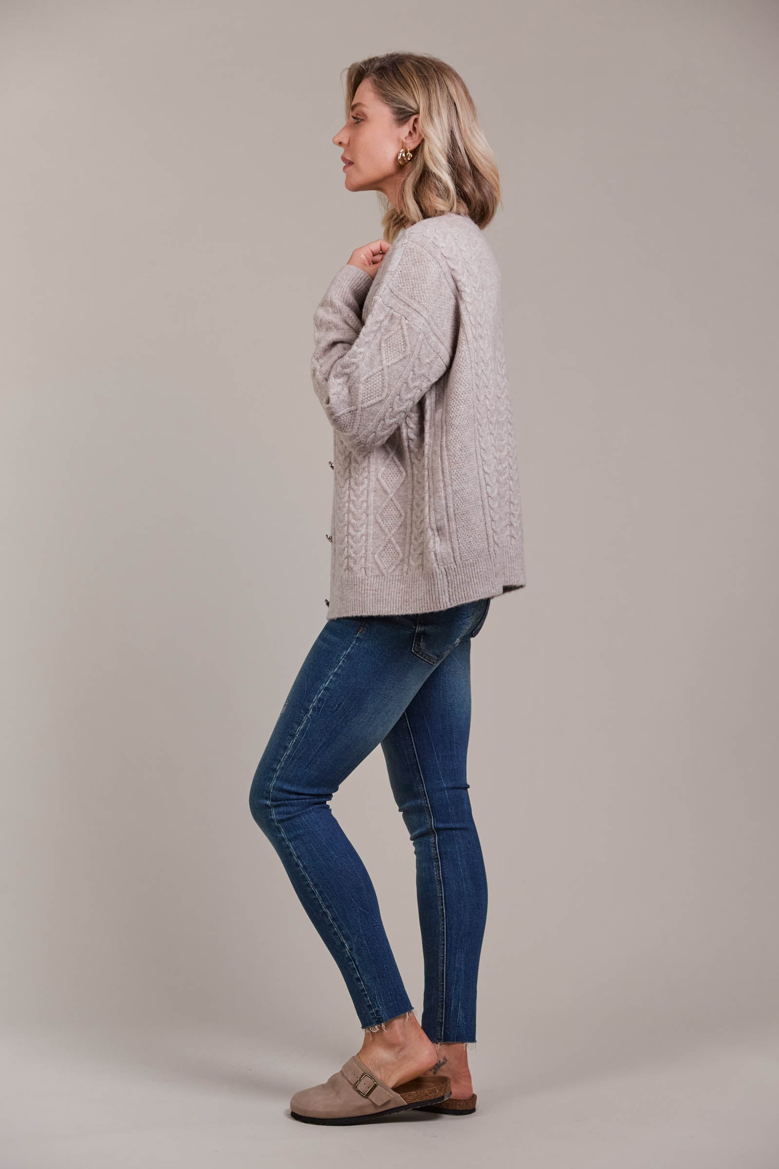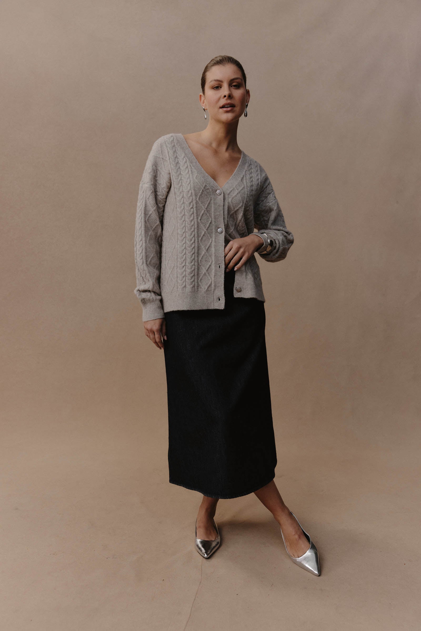 Ideal for those crisp autumn days, the Merano Crop Cardigan is a cosy, stylish layer to throw over any outfit. Made from a luxurious wool blend, this cardigan has a flattering V-neck and a charming cable-knit pattern, secured with a four-button closure. It's the perfect casual outerwear for relaxed days, adding a touch of texture and warmth. Drape it over your shoulders during the warmer parts of the day for a chic, layered look, then button it up when the air turns cooler.
