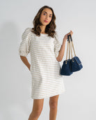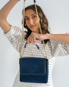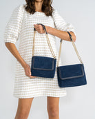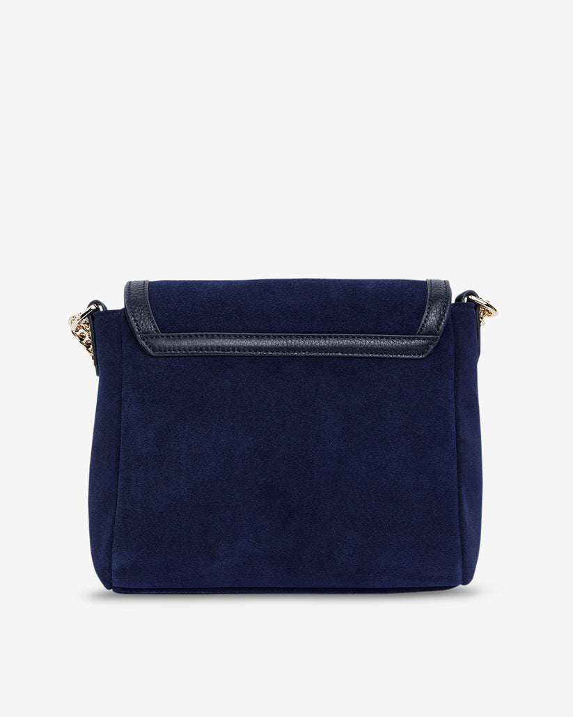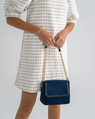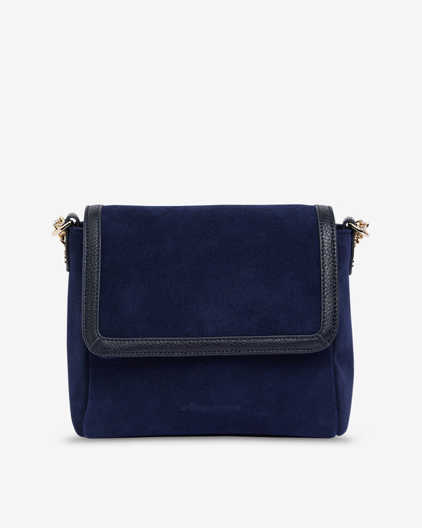 The Arlington Milne Mini Antonia Bag is crafted from premium materials such a pebble leather and premium suede. The bag features light gold hardware, an embossed logo and an attached chain & leather shoulder strap that can be adjusted to two different lengths. The top flap opens to an ample centre compartment featuring Arlington Milnes signature hot pink lining and suede trimmed card slots.