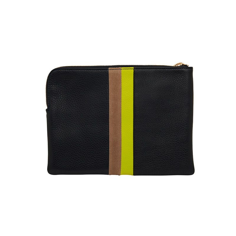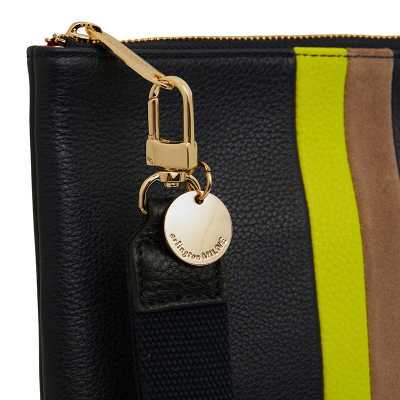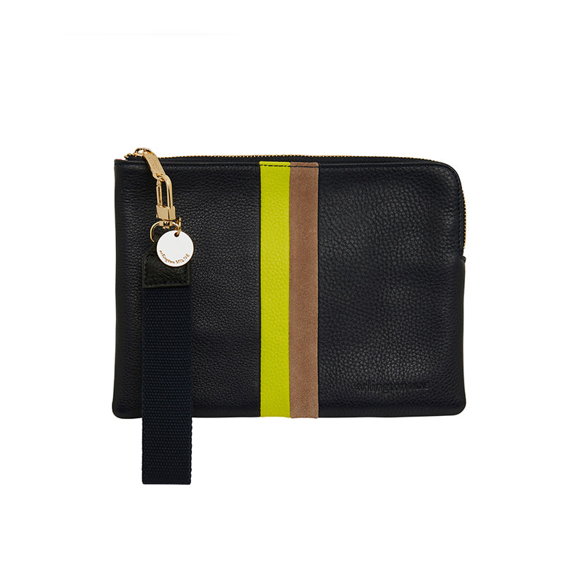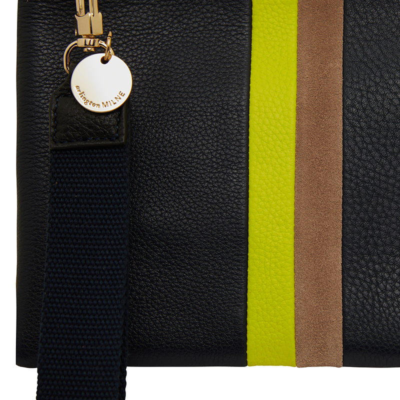 The Arlington Milne Paige Clutch is crafted from premium leather or suede. The clutch features a two-tone centre stripe detail, light gold hardware, an embossed logo, and a detachable wristlet. The Paige clutch opens to reveal Arlington Milne's signature hot pink twill lining and internal leather/suede card slots.