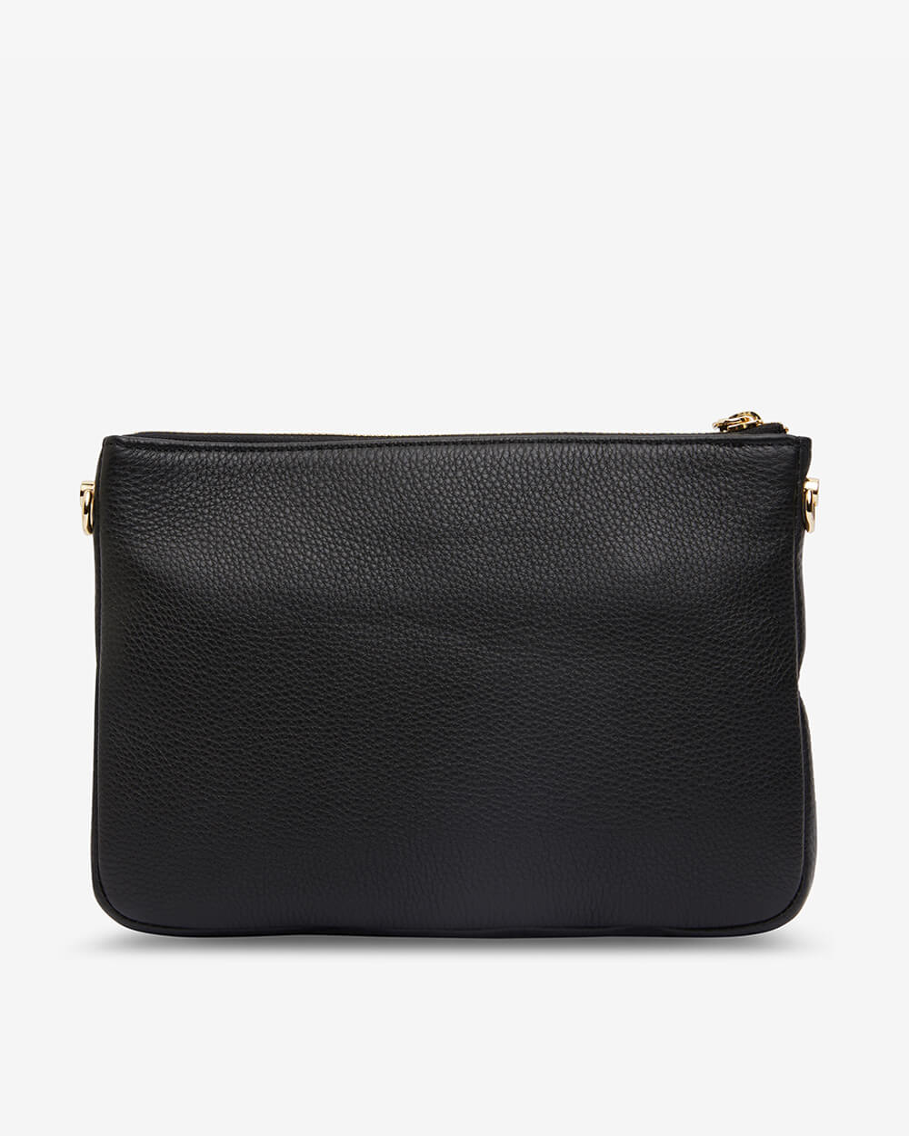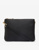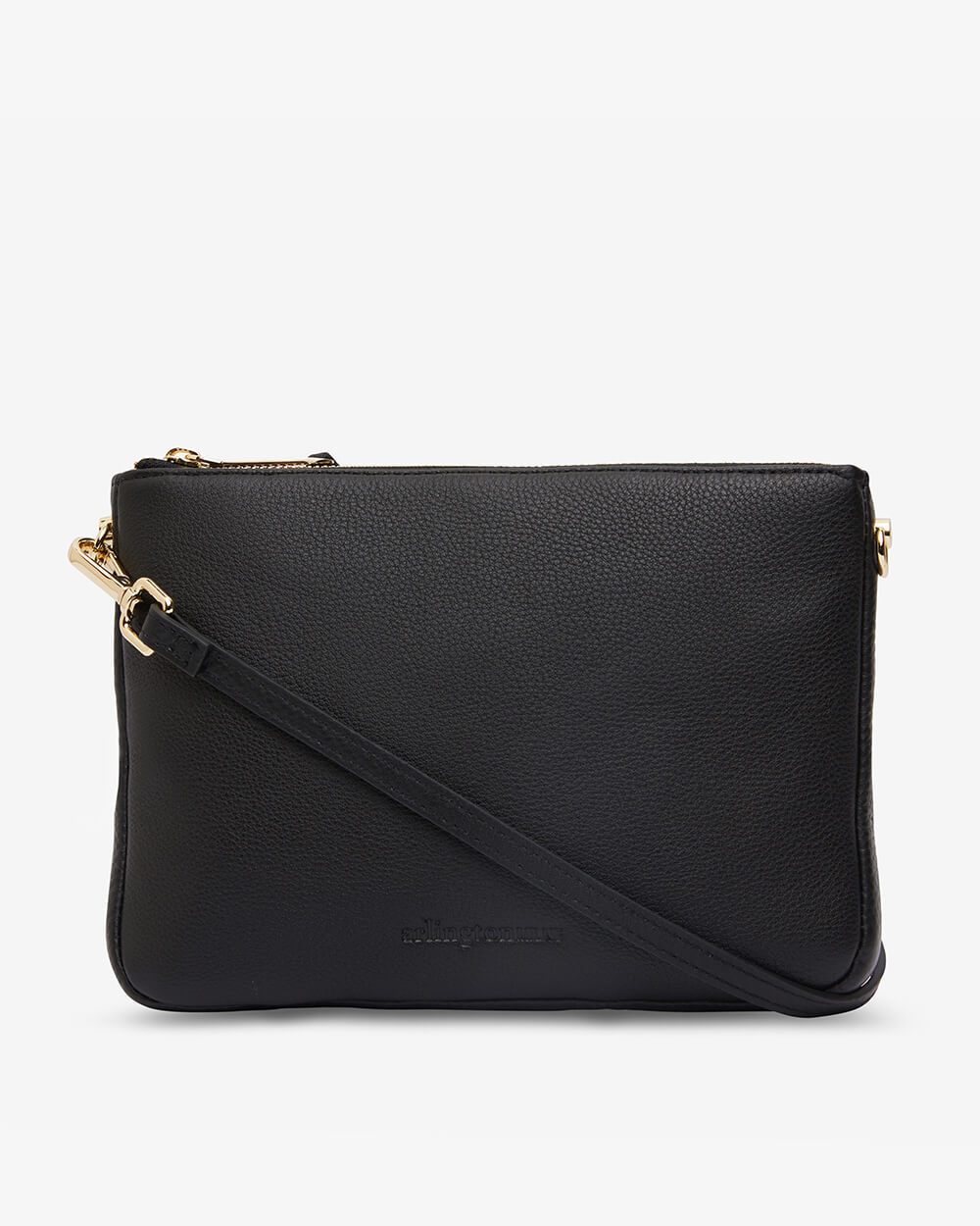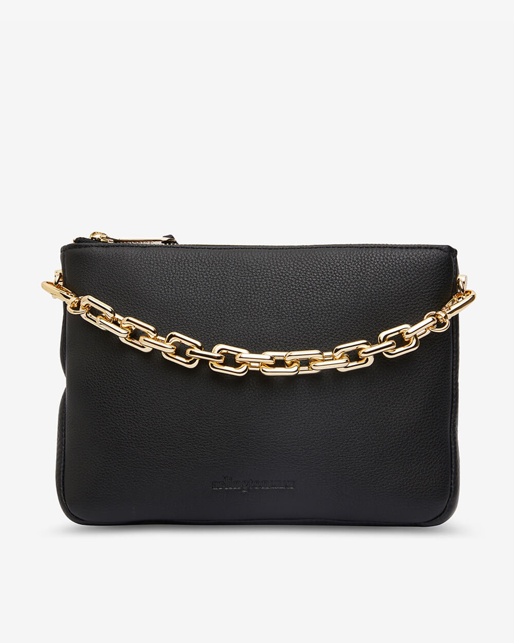 The Arlington Milne Samantha Crossbody in Black is crafted from premium leather and features a decorative front chain detail. Samantha can be carried clutch style or worn using the long shoulder strap. The top zipper opens to reveal Arlington Milnes signature hot pink lining, a zipper pocket, and an open top slip pocket, both with leather trim.