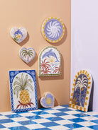 Introducing Soleil, our collection of capiz wall tiles that brings a touch of tropical paradise to your space. Immerse yourself in the warm hues and vibrant energy of original artwork featuring pineapples, palm trees, and dolphins, beautifully rendered in a palette of sun-kissed tones highlighted by shades of blue and lavender.